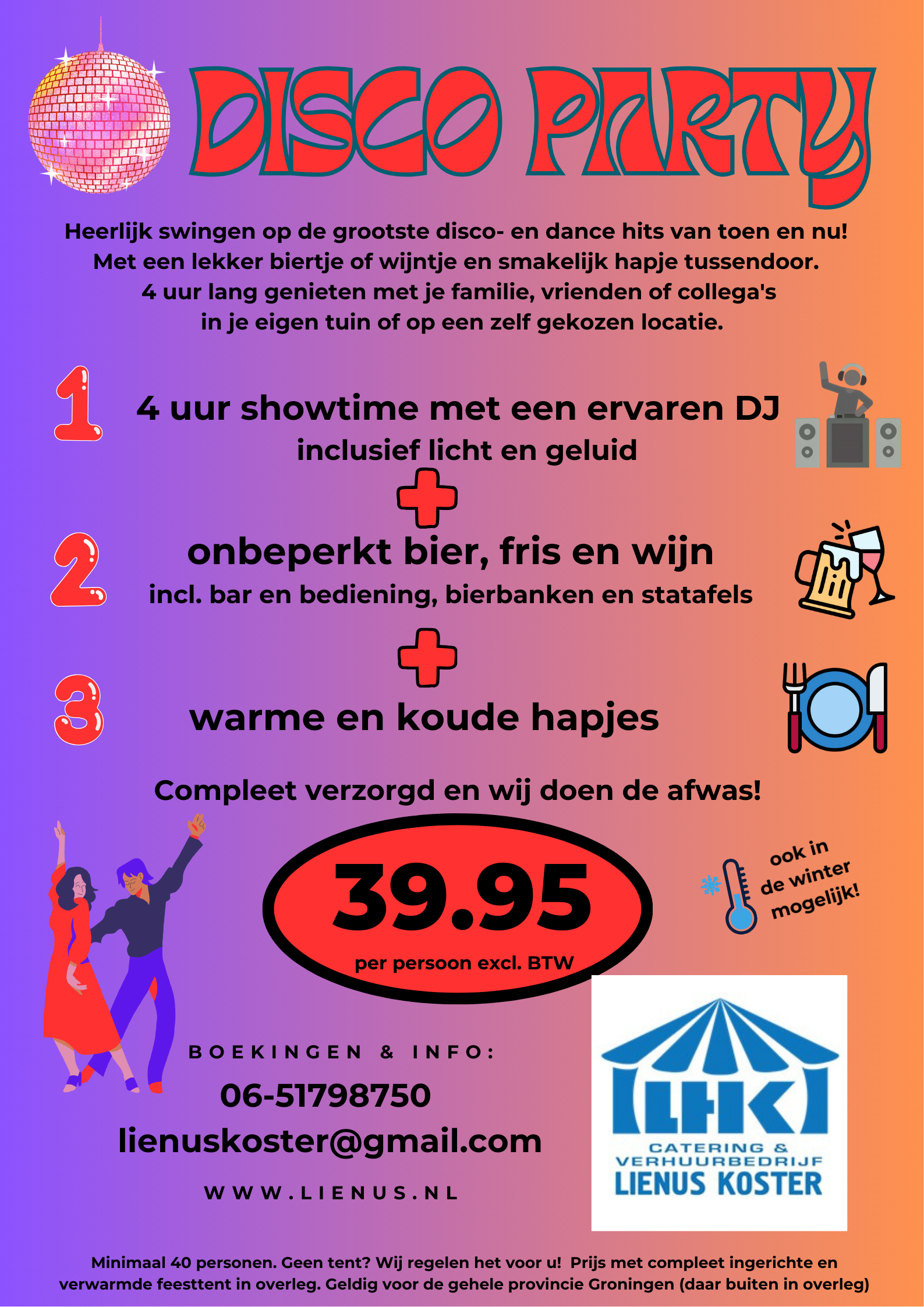 Met onze passie voor evenementenplanning creërden wij totaalpakketten die voldoen aan ieders wensen. Onze transparante prijzen per persoon garanderen dat u nooit voor verrassingen komt te staan. We streven naar een zorgeloze ervaring, waarbij wij u al het werk uit handen nemen, zodat u en uw gasten volop kunnen genieten van het feest. Wij zorgen ervoor dat elk moment van uw evenement perfect is. Allemaal op een door u zelf gekozen locatie, in uw eigen tuin, in een tent, grote schuur of op uw bedrijf. Alles is inclusief brengen en halen, bediening en wij doen de afwas! Heeft u een (verwarmde) compleet ingerichte feesttent nodig? We leveren tenten van klein tot groot tegen meerprijs, inclusief de opbouw. Kiest u ervoor om een feest te geven zonder thema: Geen probleem, onze zeer ervaren DJ's zorgen voor de perfecte mix die u en uw gasten volop laten genieten.